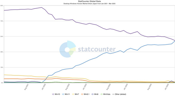 まもなくサポート終了が予定されているWindows 10だが、今なお日本国内において利用されているデスクトップパソコンの約半数に及んでいることが、2025年3月時点のStatCounter(図1)においてもわかる。