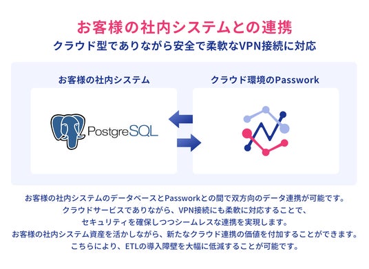 当社がこれまで手掛けてきたシステム開発において、頻繁に直面した課題が、お客様の社内システムとクラウド環境の分断問題です。クラウド環境から社内システムへのデータ取得を開始できなかったり、社内システムへのデータ書き込みが実現できなかったりするケースが数多くありました。 この課題を解決するため、『Passwork』はクラウド型SaaSでありながら、お客様のシステムとVPNで接続できる設計を当初から採用しています。