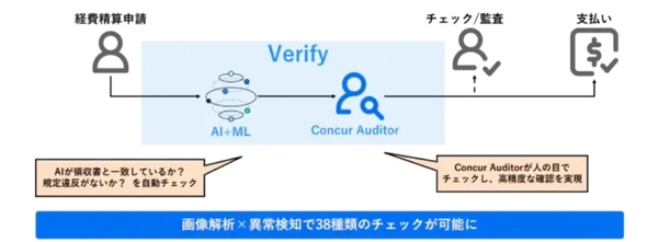 Verifyは、同社の従業員立替経費サービスである「Concur Expense」の有料オプションとして提供される。申請された経費データを、AIや機械学習、さらには経験豊富なコンカーのAuditor(監査)による人の目でチェックすることで、経理精算の承認業務を代行する。