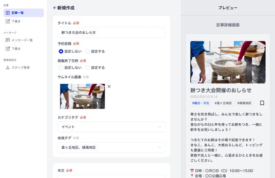 自治体側が使用する管理画面は分かりやすいUIになっており、配信内容を感覚的に入力することができます。また、ブランドカラーやシンボル画像をカスタマイズすることもできるので、各自治体毎のオリジナルアプリのような形で提供する事ができます。