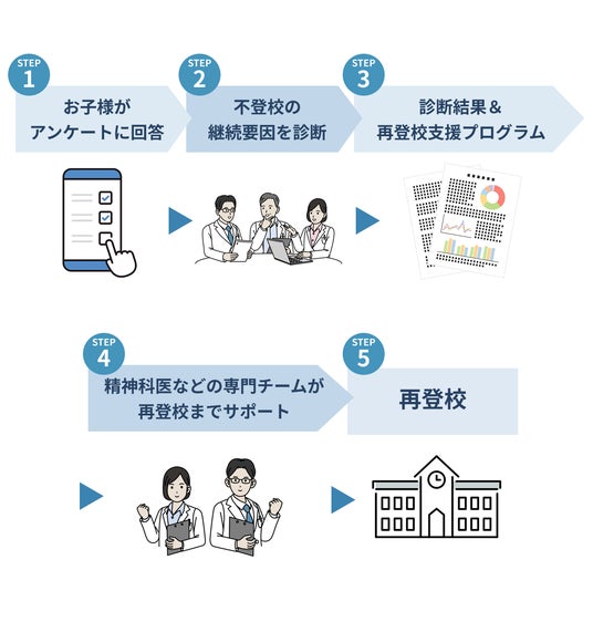 ToCoは、AI技術を活用した個別診断と、精神科医や児童心理司を含む専門家チームによる伴走支援を特徴としています。AIが不登校の背景や要因を分析し、各家庭に最適な支援を立案。精神科医や児童心理司を含む専門チームが子どもの心の負担を軽減しながら、無理なく再登校へと導きます。