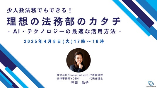 株式会社Connected with(本社:東京都中央区、代表取締役:坪田晶子)は、2025年4月8日(火)17時から「理想の法務部のカタチ - AI・テクノロジーの最適な活用方法 -」を開催します。
