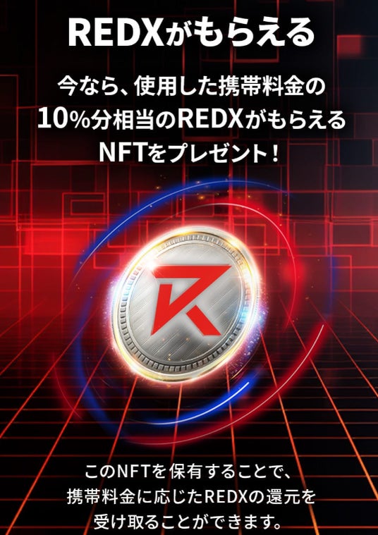 今なら使用した携帯料金の10%相当分のREDXがもらえるNFTをプレゼントします。このNFTを保有することで、携帯料金に応じREDXの還元を受け取ることができます。