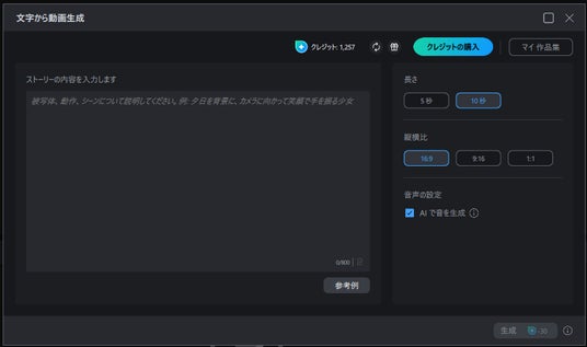 文字から動画生成:5 秒 / 15 クレジット 10 秒 / 30 クレジット