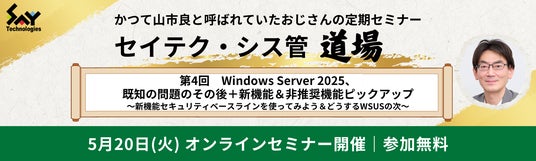 5 月 1 日で正式リリースから半年が経過する Windows Server 2025 の最新情報や BOM 8.0 SR2 の強化ポイントについて、弊社の Microsoft MVP 山内が講師を務める無料ウェビナー「セイテク・シス管道場 第 4 回 Windows Server 2025、既知の問題のその後+新機能&非推奨機能ピックアップ ~新 機能セキュリティベースラインを使ってみよう & どうする WSUS の次~ 」にて、解説いたします。 ぜひご参加いただき、BOM 8.0 の新機能を体感してください!