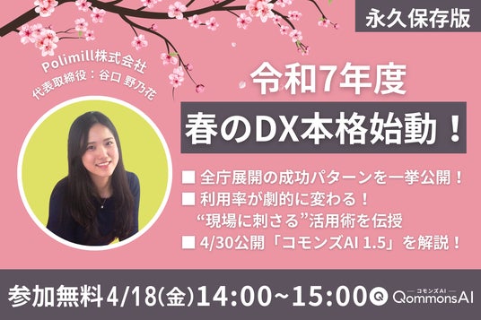 全国150以上の自治体に導入されている「コモンズAI(QommonsAI)」を提供するPolimill株式会社(本社:東京都港区、代表取締役:伊藤あやめ、谷口野乃花)は、生成AIを全庁で効果的に活用するためのノウハウを共有する無料オンラインセミナーを、2025年4月18日(金)に開催いたします。