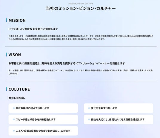 企業理念ページでは、当社のミッション・ビジョン・カルチャーについて紹介しています。