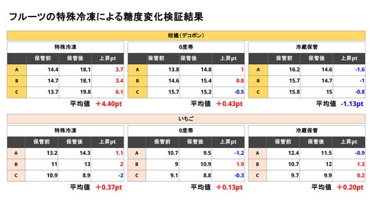 このたびのフルーツの特殊冷凍による糖度変化検証では、柑橘(デコポン)、いちごを対象とし、デイブレイクの特殊冷凍機「アートロックフリーザー」で冷凍後に-25℃で保管したもの、0℃、常温で保管したもの(保管期間はいずれも1日)の3つのパターンを、それぞれA~Cの3個体で計測しました。その結果、特に柑橘類において特殊冷凍後に糖度が上昇。平均値で比較すると、冷蔵保管は保管後に-1.13ptで糖度が減少した一方、特殊冷凍後は+4.40ptで、最大6ポイント以上の糖度上昇が確認されました。