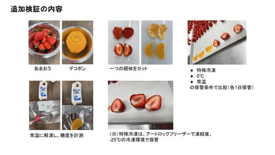 この糖度上昇のメカニズムは研究中ですが、高品質な冷凍技術により甘味を閉じ込めるとともに、酵素の働きによる糖度変化が起きたと推測しています。また、柑橘類では明らかな糖度上昇が確認できましたが、いちごは0℃や冷蔵保管と大きな差が見られなかったことから、特殊冷凍による糖度上昇は、品種によって差があることも明らかになりました。