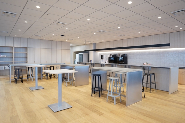 執務エリアの中心に設置する「カフェエリア」は、あたたかい家具と木目調の設備をベースにしており、社員が気軽に集い、会話をしたり休憩をしたりできる空間が演出されている。
