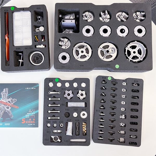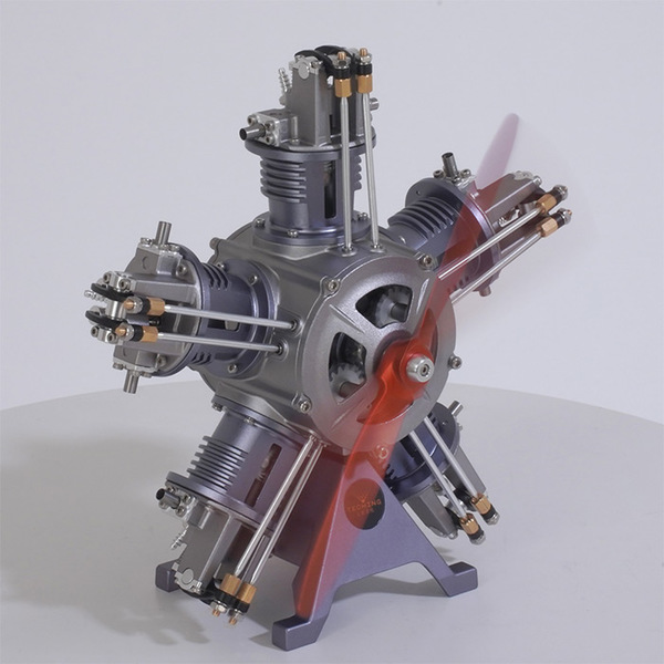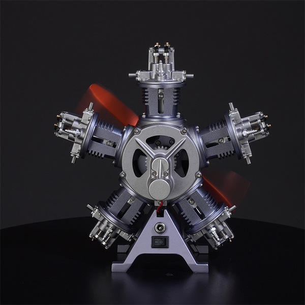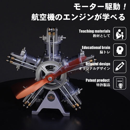 この模型は金属のアルミダイキャスト製で約250パーツから構成され、組立て完成後にモーターでエンジンが駆動する機能を持ちます。5つのピストンが順次に作動してクランクシャフトを回転させる様子を観察・学習することができます。
