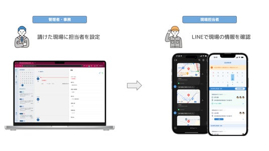 事務や管理者が登録した現場の情報が現場を担当する従業員のLINEに自動で配信される機能管理者や事務は現場担当者に個別で現場の情報を1件1件送る手間を削減することができ、従業員も新しいアプリのダウンロードや難しい設定など行わず、使い慣れたLINEからサービスを利用することが可能に