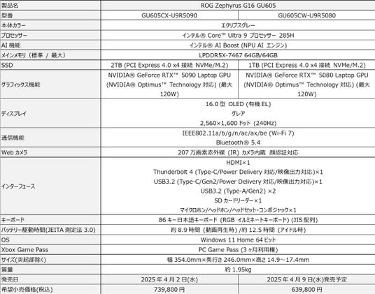 NVIDIA(R) GeForce RTX(TM) 5090 Laptop GPUを搭載した、「ROG Strix SCAR 18 G835LX」および「ROG Strix SCAR 16 G635LX」は本日より予約を開始し、4月下旬順次発売開始予定となり、「ROG Zephyrus G16 GU605CX」は本日より発売開始となります。またNVIDIA(R) GeForce RTX(TM) 5080 Laptop GPUを搭載した「ROG Strix SCAR 18 G835LW」および「ROG Strix SCAR 16 G635LW」、「ROG Zephyrus G16 GU605CW」は現在予約受付中となり、4月9日(水)に発売予定となります。