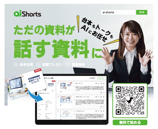AIが資料を解析し、最適な台本を自動生成。さらにナレーション付きの「話す資料」として動画化する「AI Shorts(エーアイショーツ)」をご紹介します。