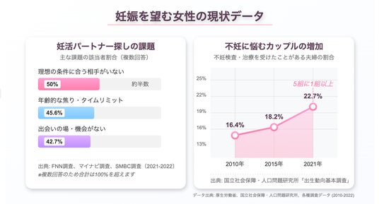 少子化が深刻化する日本社会において、「子どもを授かりたい」という切実な希望を持ちながらも、様々な事情や生物学的な課題によって思い通りにならない方々が増えています。国立社会保障・人口問題研究所の調査によると、子どもを希望する成人の多くが、適切な環境や条件の中で子どもを授かる機会を求めています。医学的サポートを必要とする方々も含め、子どもを授かるための選択肢として、価値観や目標を共有できる妊活パートナーとの出会いの場が十分に提供されていないのが現状です。従来の出会いの場では、「子どもを授かること」に特化した関係構築が難しく、この社会課題に対応するサービスが強く求められていました。