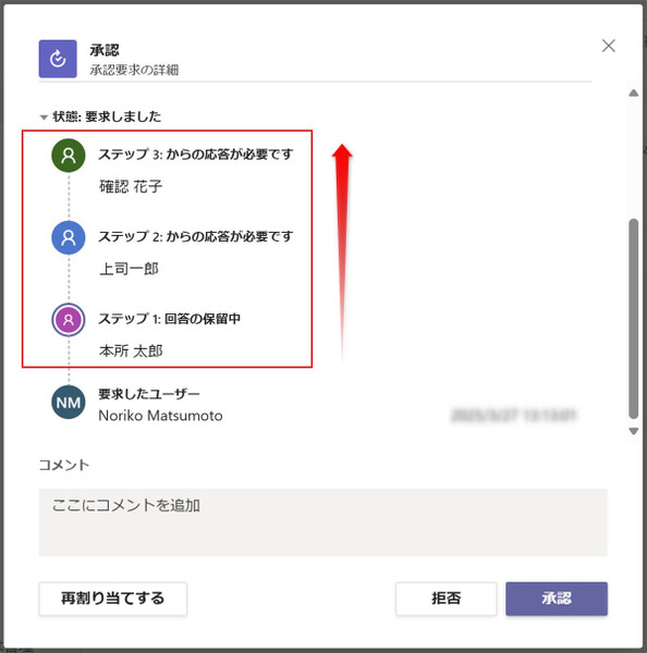 なお、承認者の誰か一人でも「拒否」するとフローは終了し、申請者および承認者全員にTeamsで「承認結果」が通知されます。