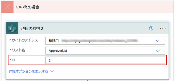 ここで設定する内容は「はい」の場合と同じですが、IDのみ「2」に変更します。このアクションにより、承認ルート「経費申請承認」の承認者情報を取得できました。