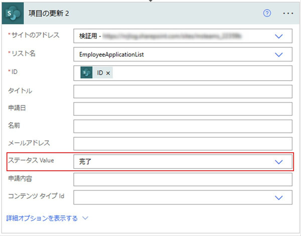 最後に、SharePointリスト「EmployeeApplicationList」のステータスを変更する処理を追加します。