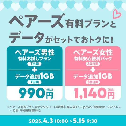 ペアーズの「男性有料お試しプラン(7日間)」とpovo2.0の「データ追加1GB(7日間)」(390円相当)がセットになったデータトッピングを990円で提供します。