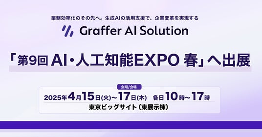 生成AI活用による企業変革を実現する株式会社グラファー(本社:東京都渋谷区、代表取締役:石井大地、以下「当社」)は、2025年4月15日(火)~17日(木)に東京ビッグサイトで開催される「第9回 AI・人工知能EXPO【春】」に出展します。当社ブースでは、汎用的な生成AIサービス「Graffer AI Studio」から、企業固有の複雑な業務に特化した「カスタム業務アプリ」まで、生成AIを幅広く活用できるサービスを紹介します。また、新サービス「AI音声文字起こし」の展示や、AIエージェントなど最新事例に関するショートセミナーを実施します。今後も当社は、生成AIの利用をより簡単かつ日常的に、さらに高度に活用できる包括的なソリューションを提供してまいります。