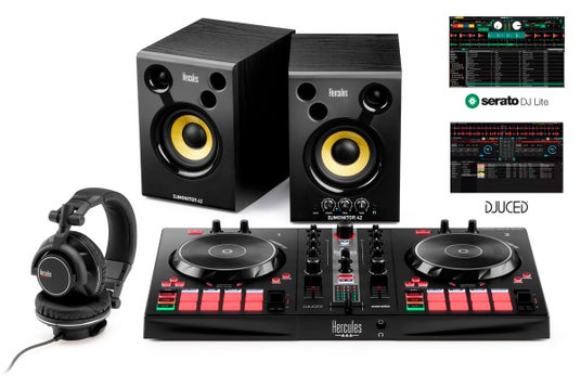 Hercules「DJ Essentials Kit」は、2デッキUSB-DJコントローラー、20Wアクティブスピーカー、ヘッドホン、Serato DJ Lite/DJUCEDソフトウェアがセットになった、これからDJを始める方に最適なコンプリートキットです。