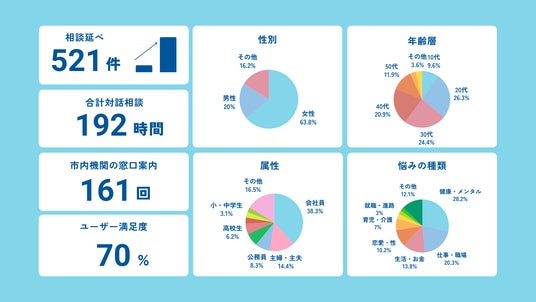 2ヶ月間で姫路市住民から寄せられた521件の相談(合計対話時間:192時間)に傾聴AIが自律対応し、ユーザー満足度は70%を記録しました。