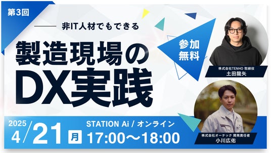 生成AIに関する研修・内製化支援事業を展開する株式会社TENHO(本社:東京都渋谷区、代表取締役:田村 允)は、4月21日(月)17時~、STATION Aiとオンラインの同時接続にて、製造業DXに関するセミナーを開催します。