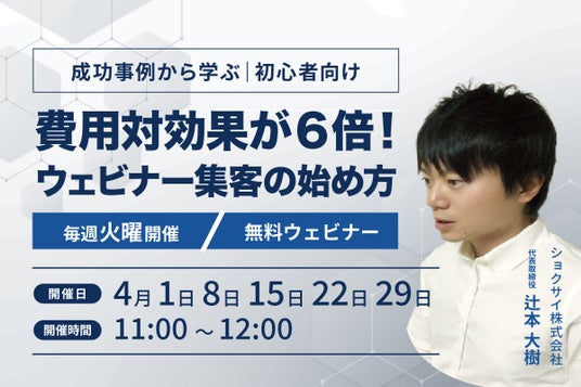 ショクサイ株式会社(代表取締役:辻本 大樹)は4月1日(火)11時よりBtoBマーケティング担当者向けに「費用対効果が6倍!ウェビナー集客の始め方【初心者向け】(成功事例あり)」を開催いたします。