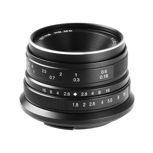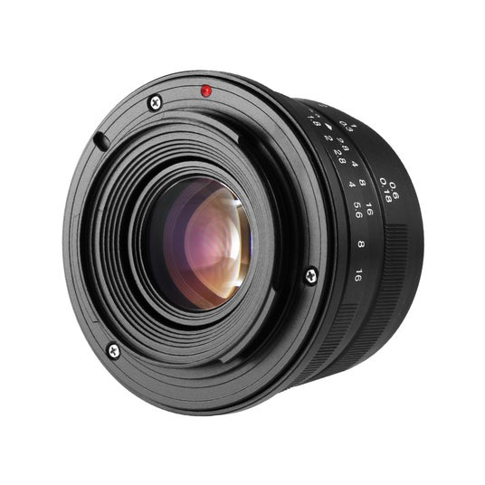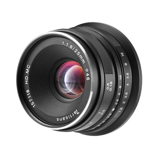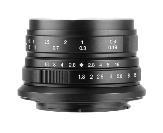 七工匠(しちこうしょう)7Artisans 25mm F1.8は最短撮影距離0.18mで、高い近接撮影能力を備えています。アルミニウム合金を使用した上質な外観。絞りリングはクリック感のない無段階式で、動画撮影も楽しめます。