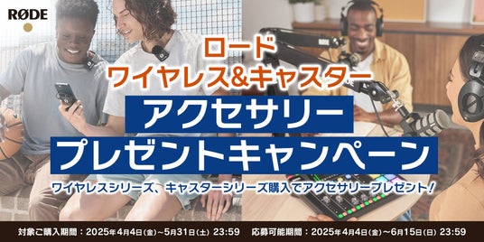 銀一株式会社は、期間中にRØDE Microphones(ロードマイクロフォンズ)のRØDEワイヤレスシリーズ、RØDEキャスターシリーズの対象製品を国内正規販売店でご購入いただき、専用フォームからご応募いただいた方全員に、便利なアクセサリーをプレゼントするキャンペーンを実施いたします。