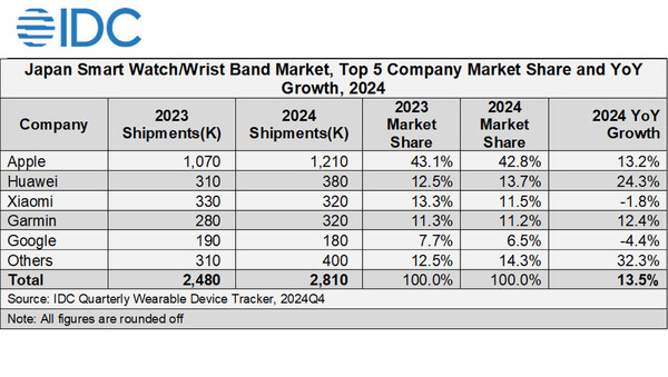国内ウェアラブルデバイス市場(イヤフォンなどのイヤーウェア、スマートウオッチ、リストバンド、スマートグラスなど)の2024年実績値。出荷台数は1241万台で前年比3.1%の増加。カテゴリ別ではスマートウオッチ/リストバンドが好調で、前年比13.5%増の出荷台数281万台となった。同カテゴリではアップルが42.8%のシェアを持つが、上位メーカーではファーウェイ(13.7%)、ガーミン(11.2%)の2社の成長が目立つ。
