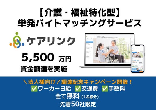 「ケアリンク」は、初の資金調達を記念した「初回無料お試しキャンペーン」を4月7日より開始いたします。初回マッチングに限り、ワーカーの日給・交通費・手数料がすべて無料でご利用いただけます。