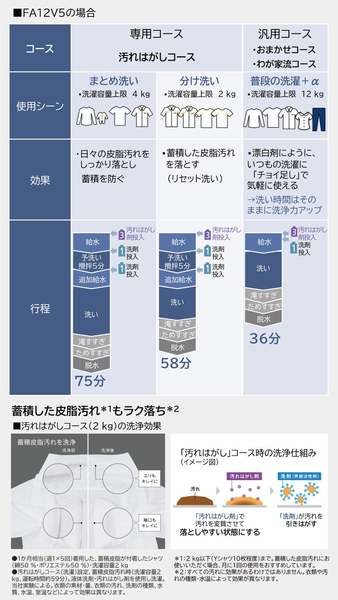 この新型モデルには「汚れはがしコース」が搭載されており、専用の洗濯用洗浄強化剤「極ラク汚れはがし」を使用することで予洗いを必要とせずに皮脂汚れを効果的に落とすことができる。
