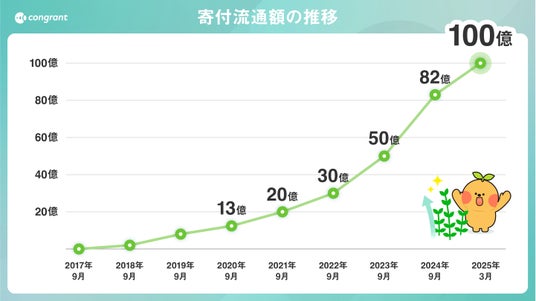 2017年のサービス開始から2020年5月に寄付流通額は10億円に到達し、その後2倍近くの成長率で寄付流通額は伸び、2025年3月に100億円を突破しました。これまでに発生した寄付件数は延べ123万回を超えます。