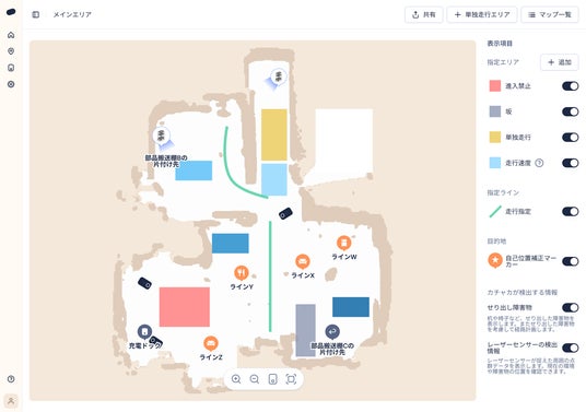 - 管制管理機能:狭い通路でのすれ違いや交差点での交通整理を自動制御