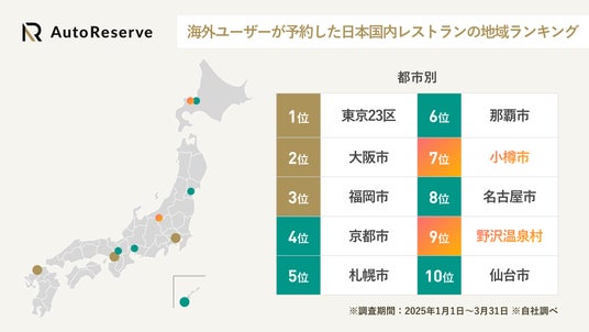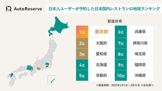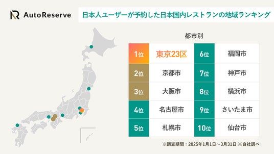 日本人がAutoReserveに掲載されているレストランを予約したデータから、予約件数の多い地域をランキング化。海外ユーザーとの違いが見て取れる結果となりました。
