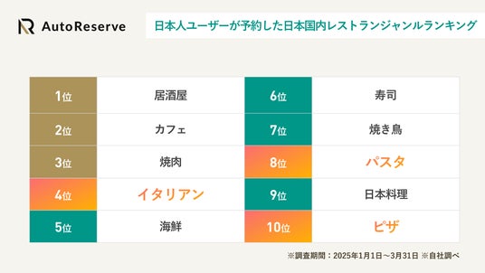 次に、日本人がAutoReserveで予約したレストランの人気ジャンルを予約件数順に10位までご紹介します。