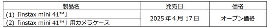 富士フイルム株式会社(本社:東京都港区、代表取締役社長・CEO:後藤 禎一)は、撮ったその場ですぐにプリントが楽しめるinstax(TM) “チェキ”シリーズの最新エントリーモデルとして、「instax(インスタックス) mini(ミニ) 41(フォーティーワン)(TM)」(以下、「mini 41」)を2025年4月17日に発売します。
