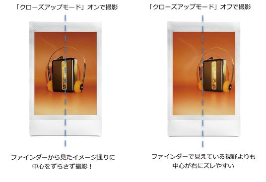 ・接写の際にファインダーから見える視野を、実際のプリントに写る範囲に合わせる機能(パララックス補正)を搭載。ファインダーでとらえた中心をずらさず、簡単に撮影できます。