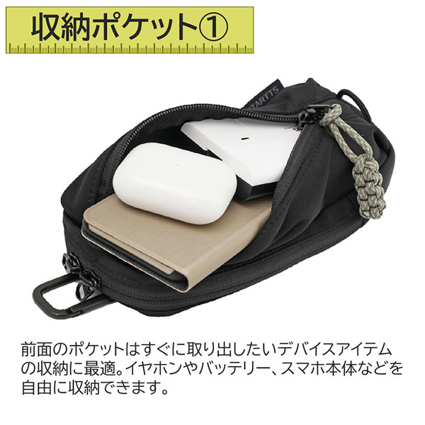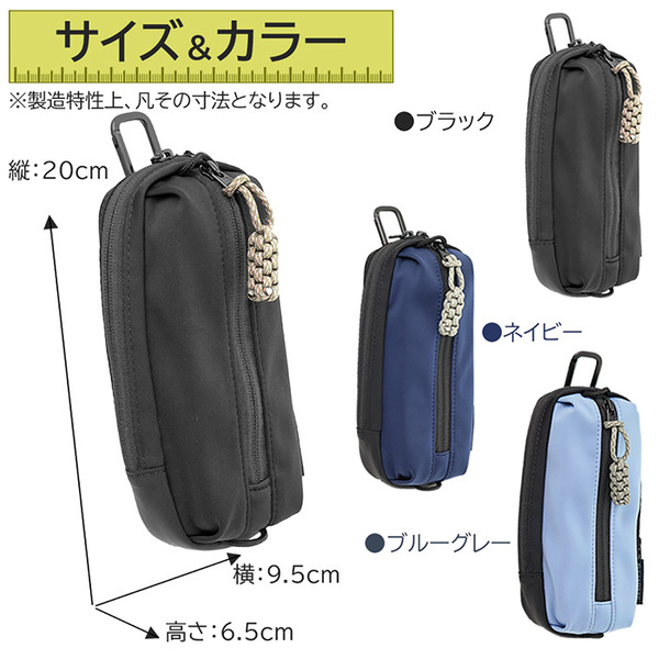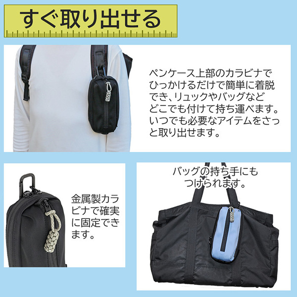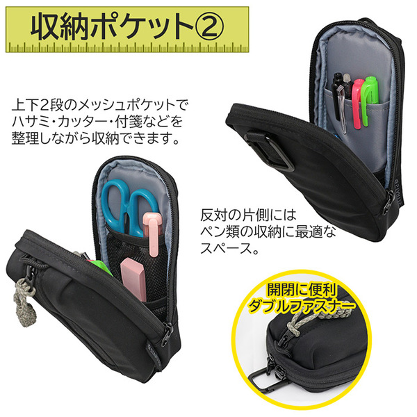 バッグメーカーならではのしっかりした造りがポイント。リュックやバッグに簡単に装着でき、通勤通学や外出先でも必要なアイテムを取り出しやすい設計です。前面ポケットには柔らかい生地を使用しており、アイテムの形に合わせて自由度の高い収納が可能。デバイスや化粧品など、多用途に使える大きめサイズで、日常のあらゆるシーンで活躍します。