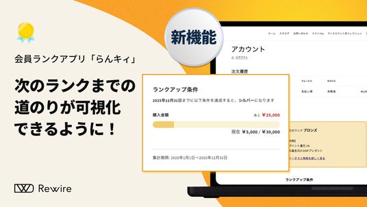 ECシステムの技術支援を行う株式会社リワイア(本社:東京都港区、代表取締役:加藤英也、以下「リワイア」)が提供する会員ランクアプリ「らんキィ」で、次回ランク更新時のランク情報や、次のランクまでに必要な購入金額や回数などの情報をアカウントページに表示することが可能になりました。この機能により、顧客が次のランク達成に向けた条件を明確に把握でき、購入を促進することができます。