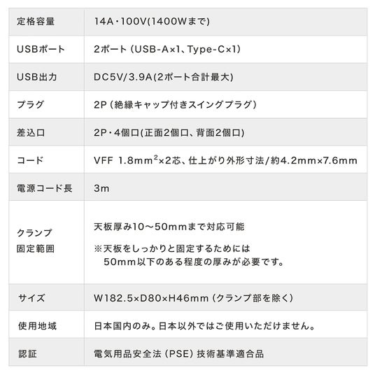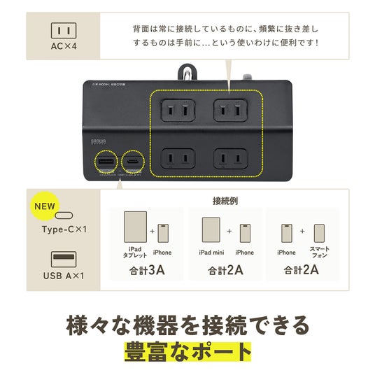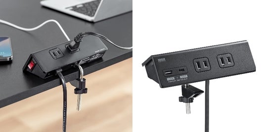 Type-CとUSB Aポートを搭載しスマホ・タブレットの充電にも対応、机にガッチリ固定できるので、ケーブルの抜き差しがしやすいクランプ付き電源タップ