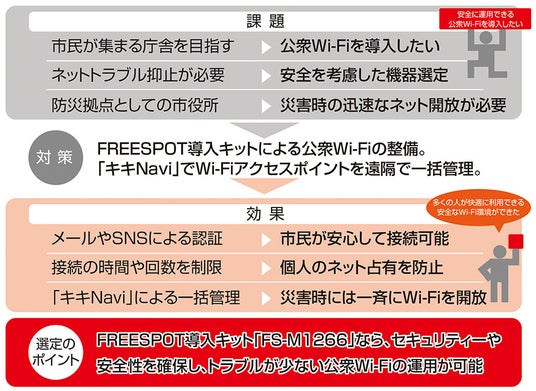 市民にとって便利な市役所を目指し公衆Wi-Fiを導入。安全面と速度などの実用面、共に満足できる環境を構築。災害時には防災拠点としてWi-Fiを開放。