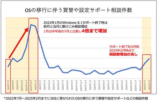 過去のOSサポート終了月には半年前と比較し4倍以上の相談が寄せられた