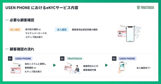 eKYCサービス導入によって、TRUSTDOCKがデジタル上で本人確認を行えるAPIを提供するほか、「USEN PHONE」の確認業務プロセス設計から運用までをワンストップで受託することにより、コスト削減と業務効率化に寄与いたします。