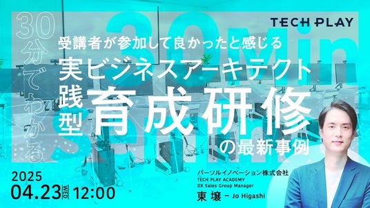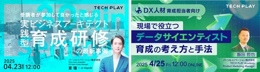 2025年4月23日(水)12:00~12:30は、ビジネスアーキテクトの育成に関するセミナー、2025年4月25日(金)12:00~12:45は、データサイエンティストの育成に関するセミナーを開催し、実践型のオーダーメイド研修でDX人材を育成する『TECH PLAY Academy』より、詳しく解説します。