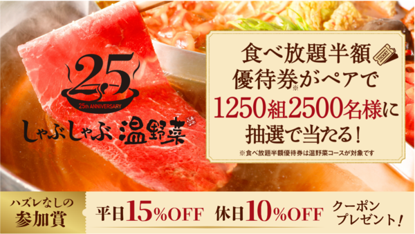しゃぶしゃぶ温野菜の「25周年記念プレゼントキャンペーン」は、温野菜公式アプリからの応募を対象に、抽選で1250組2500名に「食べ放題半額優待券(温野菜コース)」が当たるプレゼント企画。