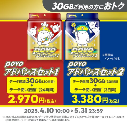 KDDI、沖縄セルラーは2025年4月10日から5月31日まで、povo2.0において、「データ追加30GB(30日間)」とデータ使い放題(24時間または3日間)(注1)がセットになった「povoアドバンスセット」を提供します。