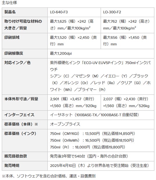 グローバルセールス&マーケティング本部 本部長 二村 龍吾は「今回リリースするLO-640/LO-300は、優れた生産性が最大の特長のシリーズ最新モデルです。印刷速度は、CMYK+White同時印刷の場合、LO-640では従来機※の約3倍となる5.0m2/h、LO-300では約2.6倍となる3.4m2/hの高速出力を実現しています」と述べています。