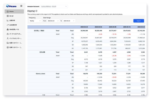 ベンダーセントラルまたはセラーセントラル、そしてAd コンソールと直接連携することで、週次・月次単位のデータ取得と更新を完全自動化。これまで手作業で統合をしていた属人的なデータ収集から解放され、分析と改善に集中でき、且つそれらの数字を、週次、月次での数字の変化やトレンドをモニタリングすることが可能です。